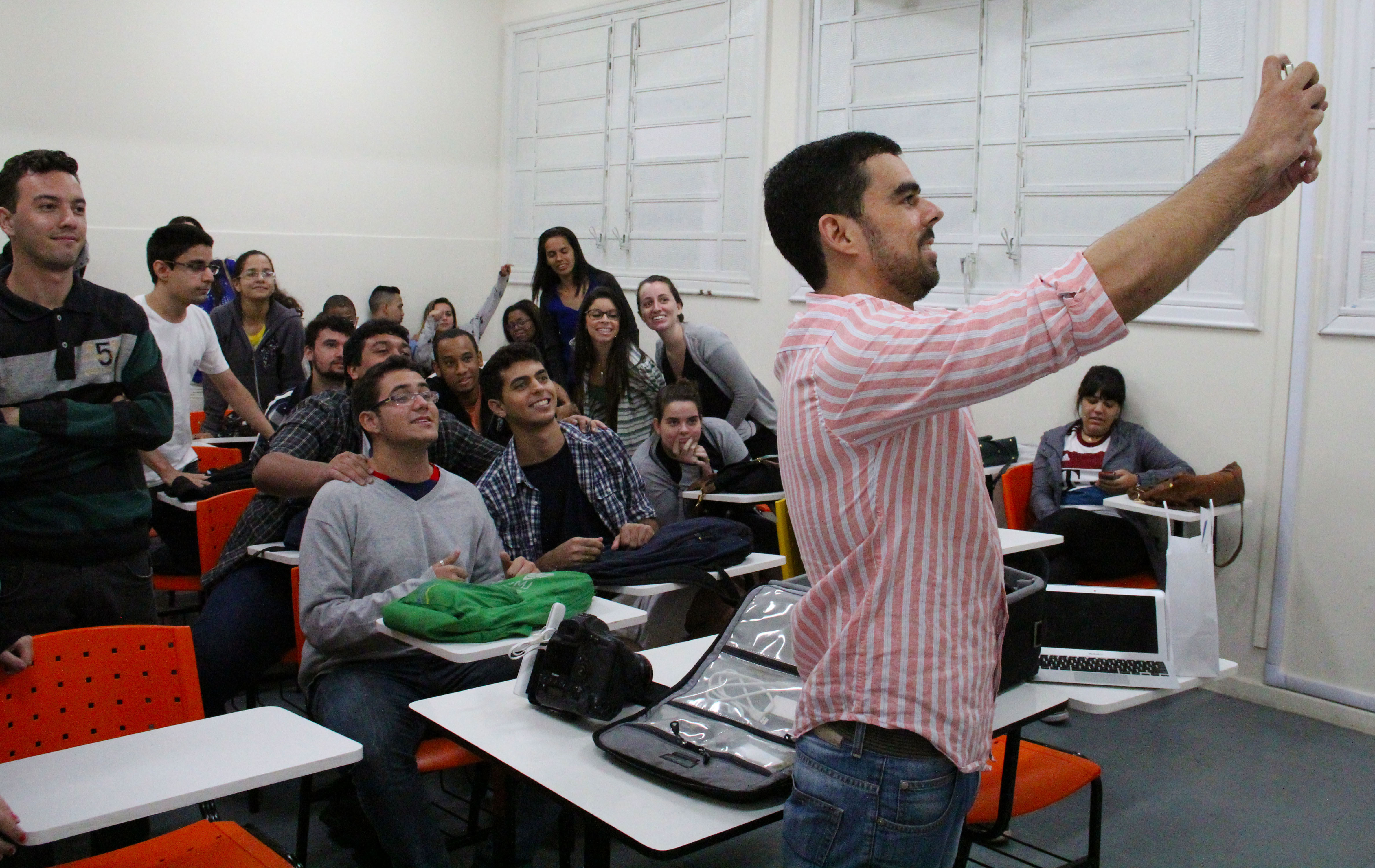 Outra ação que chamou atenção dos alunos, aconteceu quando André abriu sua mala e tirou uma Lente super teleobjetiva, que ele usa para fotografar, principalmente, partidas de futebol. Para fechar a oficina, o fotografo tirou uma Selfie com a turma para registrar o momento.