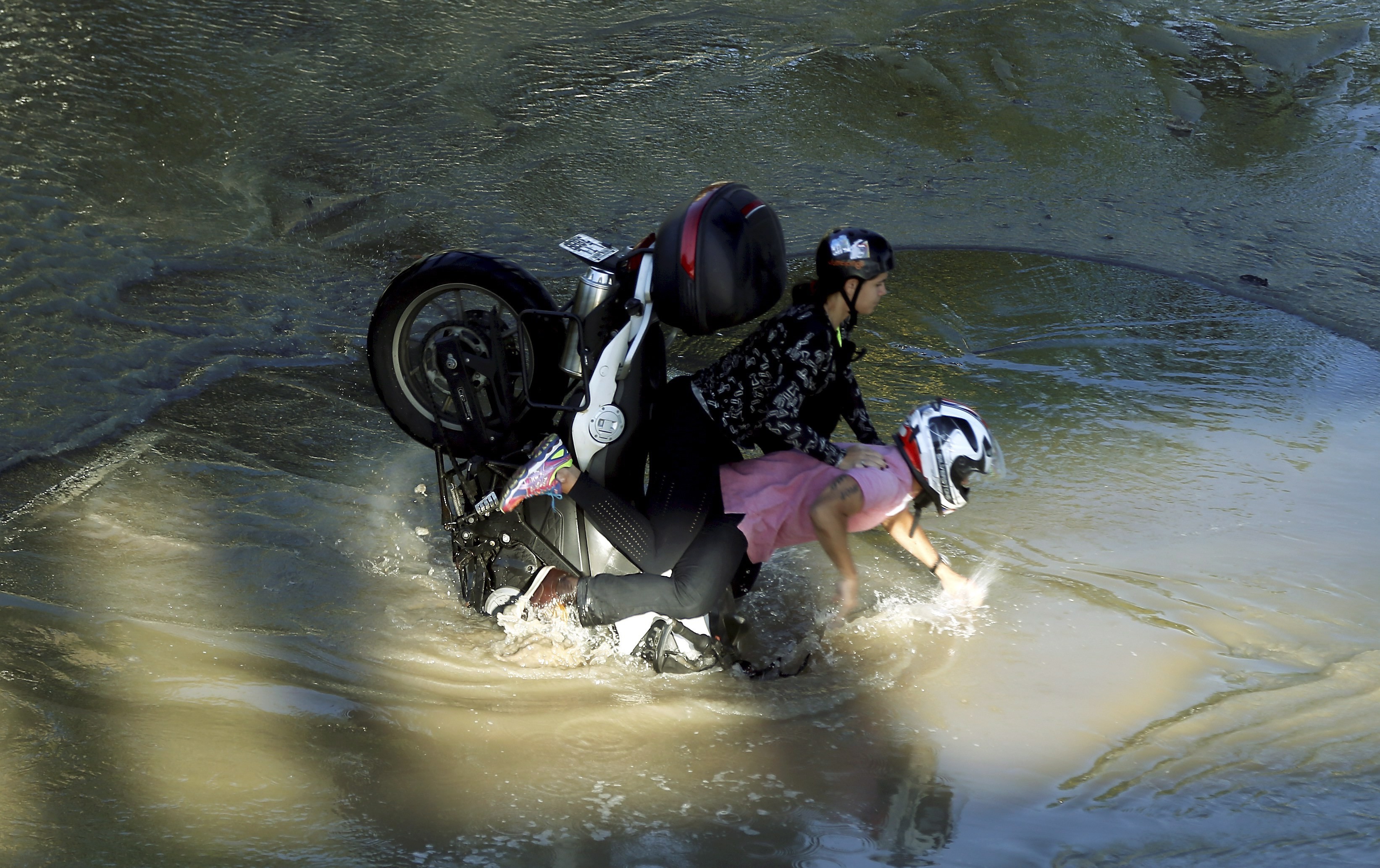 RI Rio de janeiro (RJ) 20/04/2016 - Vazamento de água da Cedae depois de rompimento de tubulação na av Radial Oeste, perto do antigo Museu do Indio, pista sentido centro.Casal cai dentro de um buraco e ficam submersos na pista . Foto de Gabriel de Paiva/ Agência O Globo