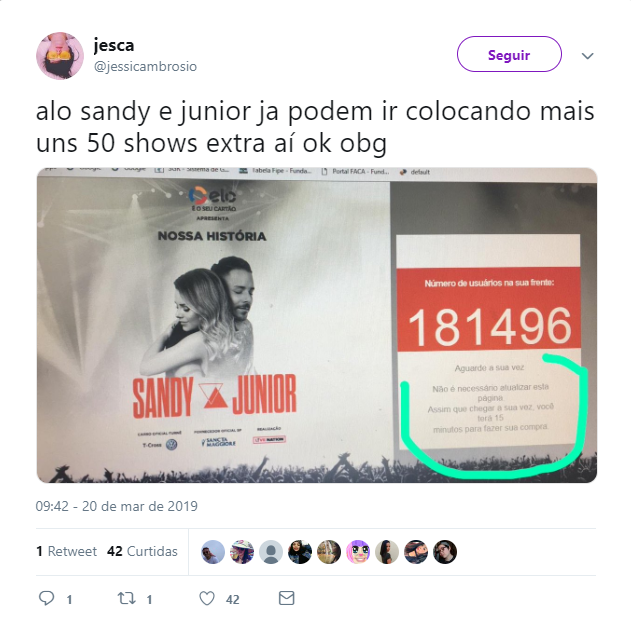 A venda de ingressos para a turnê “Nossa História”, em comemoração aos 30 anos de carreira de Sandy e Júnior, começou na quarta-feira (20), somente para clientes de cartões com bandeira Elo. Apesar da antecedência, muitos fãs reclamaram do tempo de espera para conseguir comprar o ingresso online.