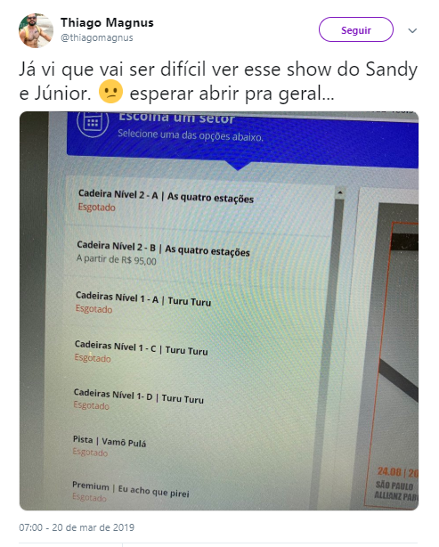 Mesmo com todos os esforços, não foram todos que conseguiram o tão sonhado ingresso para acompanhar o “turuturu” de Sandy&Júnior, já que os lotes foram rapidamente esgotados. Mas ainda não é preciso se preocupar. Apenas cerca de 40% da cota foi liberada para essa primeira fase de vendas. Ou seja, mais ingressos estarão disponíveis à meia-noite do dia 22, quando será liberada a venda oficial.O show de Sandy e Junior no Rio de Janeiro acontecerá no dia 3 de agosto, na Jeunesse Arena, Barra da Tijuca, Zona Oeste do Rio.