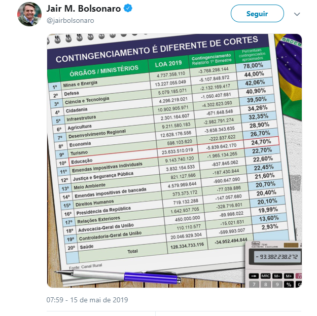 O ministro da educação Abraham Weintraub não considera um corte e sim um “contingenciamento”. Foi anunciado um corte no valor de R$1,7 Bilhão. Movimentos sociais, estudantis e partidários estão a frente dos protestos de hoje. Nas redes sociais, estudantes se manifestam usando a hashtag #TsunamiDaEducação.