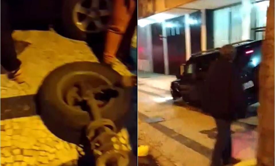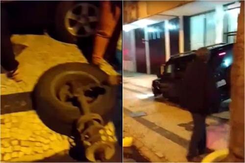 O que chamou a atenção não foi a colisão em si, mas a confusão subsequente. Após o acidente, a motorista continua a dirigir até que seu carro perde uma das rodas dianteiras ao subir na calçada da rua. A mulher, ao ser parada, nega que o pneu solto seja dela.