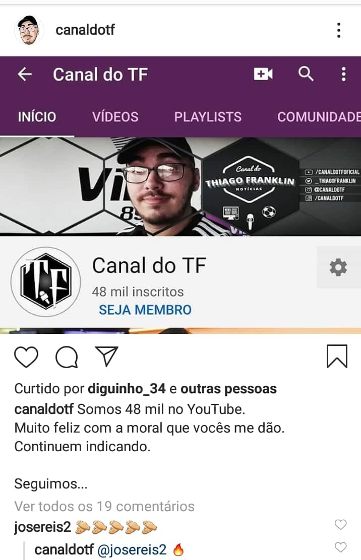 O jornalista Thiago Franklin é dono do “Canal do TF”, com foco na produção de conteúdo do Botafogo. Ele já conta com 48 mil inscritos e, além de possuir o canal, também trabalha como Assessor de Imprensa.