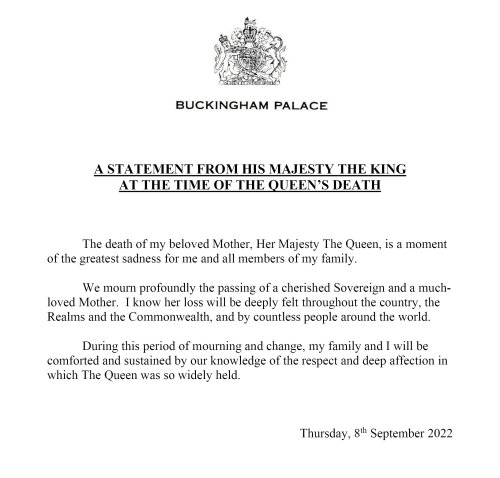 “A morte da minha amada mãe, Sua Alteza Real, é um momento de grande tristeza para mim e para todos os membros da minha família”, diz o comunicado oficial em nome do Rei pelo Palácio de Buckingham.