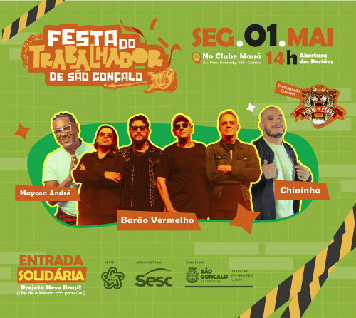 O evento em comemoração ao Dia do Trabalhador é organizado pela prefeitura, e tem como intuito trazer lazer de maneira gratuita para os trabalhadores da cidade. Haverá o show da banda Barão Vermelho, que está comemorando seus 40 anos de carreira; além de apresentações do artista gonçalense Maycon André, que abrirá os shows às 16h, e do cantor de pagode Chininha . A festa acontecerá dia 1 de maio, a partir das 14h. É gratuito, mas possui entrada solidária disponível.