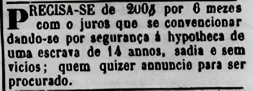 Por fim, devo admitir ter demorado a criar coragem para redigir esta crônica pois, ao encontrar aquele anúncio publicado em um jornal há mais de 150 anos, defrontei-me com sensações inesperadas — tais abalos, inclusive, interromperam a produção do meu trabalho final da faculdade por alguns dias, nos quais eu não conseguia parar de pensar naquela garota de 14 anos oferecida como garantia de um empréstimo, uma pessoa que jamais conheci, mas com a qual, de maneira estranha e inexplicável, eu sentia uma forte ligação; passei algumas noites em claro tentando imaginar como essa menina era, seu nome, suas vontades, o que teria acontecido àquela criança — sobrevivera até 1888? Integrara a massa jogada ao léu após a abolição, ou tivera um improvável destino diferente? — e esses devaneios me travaram por um tempo, provocando, inclusive, reações físicas — de cefaleias e enjoos a picos de ansiedade; o que seria de mim em um despejo ao passado? —. Porém, o bloqueio construído pela angústia teve de ser derrubado a força e a custo, pois, nesta zona do continuum espaço-tempo, traumas coletivos e ancestrais devem ficar para o travesseiro. Voltei a escrever a minha monografia.