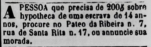 Após essa introdução — a qual creio ter se estendido em demasia —, explico onde quero chegar. Eu pensava muito sobre viagens no tempo quando criança e, depois de um longo hiato, o assunto voltou a rondar meus pensamentos, mas, desta vez, sob outra ótica. E o estopim disso me pegou de surpresa. Há alguns meses, enquanto escrevia minha monografia, percebi que, para dissertar acerca da diferença de abordagem dispensada pela imprensa brasileira a sujeitos brancos e negros seria preciso ir ao passado e analisar, também, os primeiros periódicos do Brasil. Assim, em meio à infinidade de documentos históricos disponibilizados pela Biblioteca Nacional, uma publicação se sobressaiu aos outros tantos absurdos legalizados de outrora. Nos dias 30 de janeiro, 6, 7, 8, 9 e 11 de fevereiro de 1865 uma pessoa anunciou nos Classificados do Jornal do Recife a necessidade de 200 réis por seis meses, com juros, e oferecia como garantia a “hipoteca” de uma menina escravizada de 14 anos. E a solicitação não ficou sem resposta, pois, nos dias 6, 7, 8, 9 e 11 de fevereiro de 1865, alguém orientou o solicitante a ir ao endereço Pátio da Ribeira, nº 7, na Rua de Santa Rita, nº 17, ou anunciar seu local de residência.