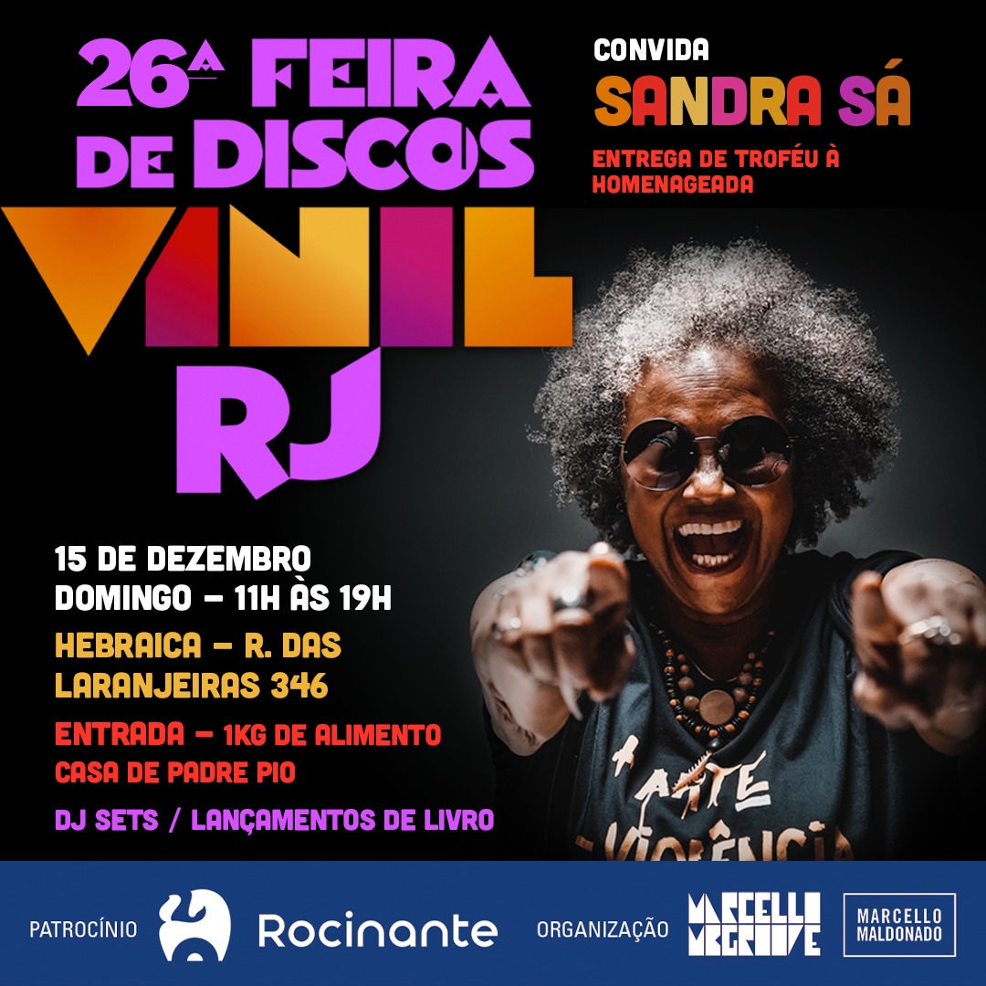 O calendário cultural carioca ganha destaque neste domingo (15) com a última edição deste ano da consagrada Feira de Vinil do Rio de Janeiro. Realizado no Clube Hebraica, em Laranjeiras, o evento chega à sua 26ª edição homenageando a cantora Sandra Sá, que receberá o Troféu Ivan Miguel Conti. A premiação, batizada em homenagem ao baterista Mamão, da banda Azymuth, já reconheceu grandes nomes da música brasileira, como Roberto Menescal, Marcos Valle, Arthur Verocai, Joyce e João Donato.