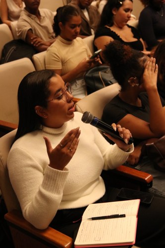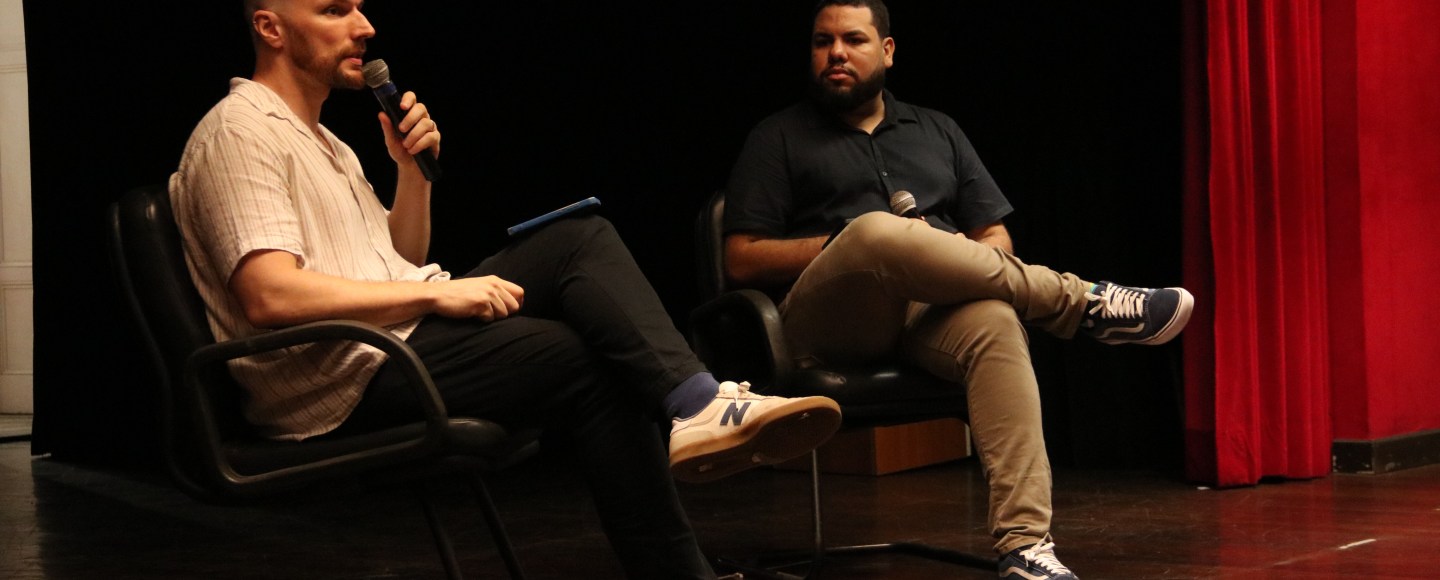A conversa teve início com uma interação com o público, na qual os alunos foram questionados sobre seus sonhos e o desejo de cursar comunicação. Matheus compartilhou sua trajetória, narrando como idealizou a faculdade, seus primeiros passos na carreira, os medos diante do novo e a importância.
